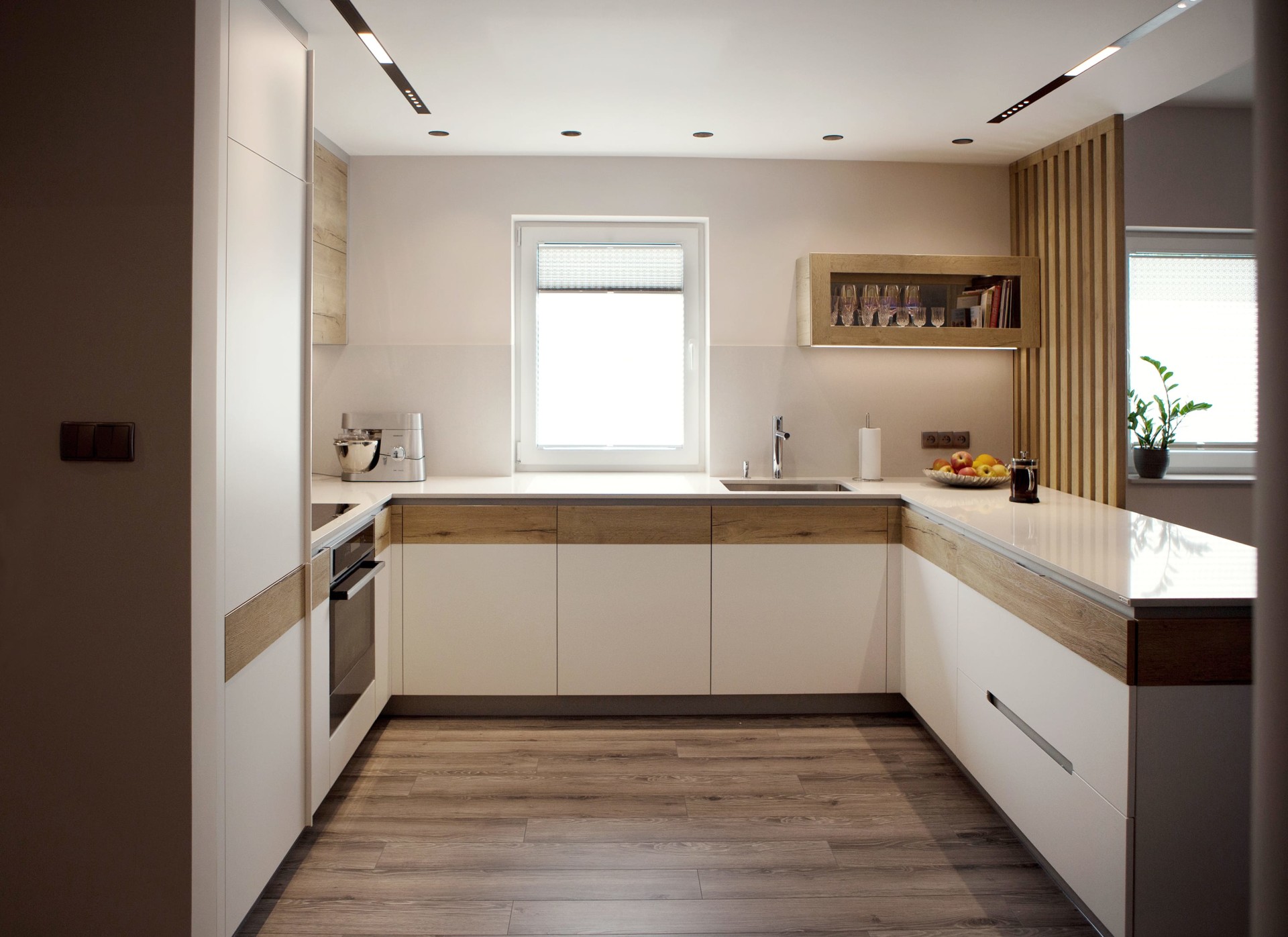 Te wnętrza zostały zaprojektowane nowocześnie z dobrym doświetleniem w postaci ciekawych, czarnych lamp. Kuchnia jest częściowo otwarta i powiększona w stosunku do pierwotnego projektu, aby zapewnić jak najwięcej przestrzeni roboczej i miejsca do przechowywania. Dekoracyjne przepierzenie zapewnia przyjemny komfort między jadalnią a częścią roboczą kuchni. W salonie ściana została wykończona płytką dla lepszego efektu wizualnego, ale również ze względu na nowoczesną kozę.