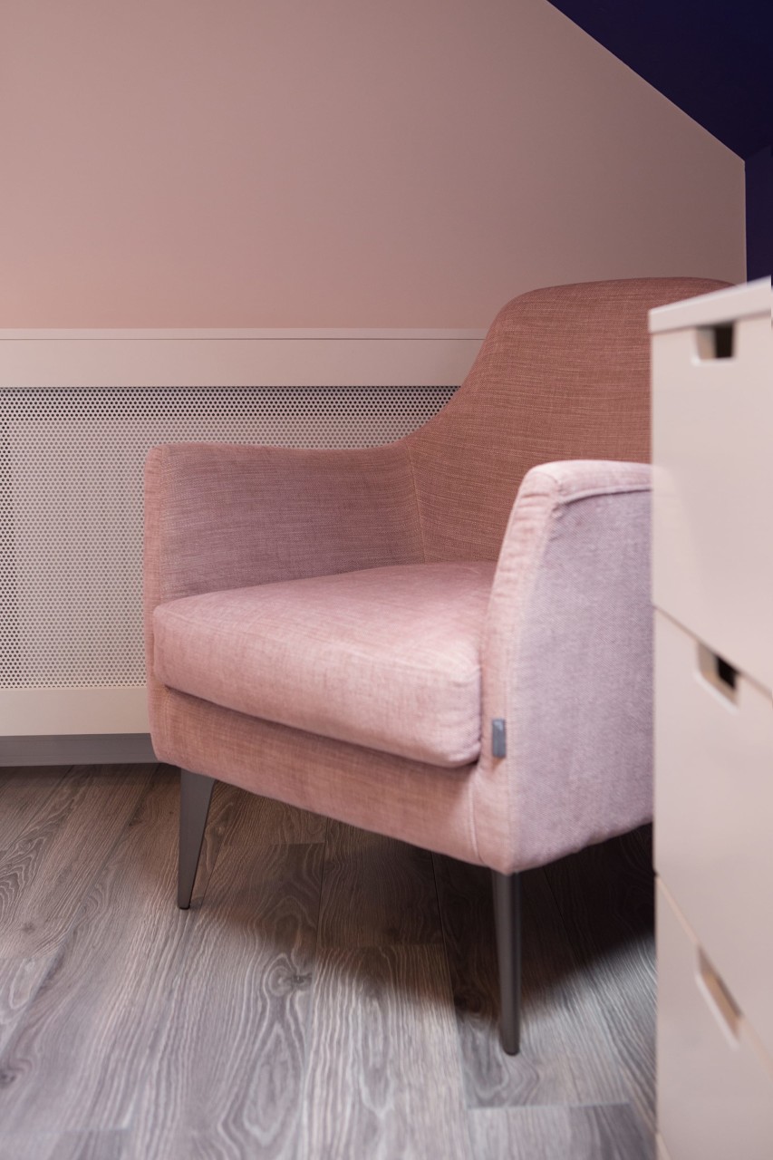 Oczywiście funkcjonalność pokoju dziecięcego przemyślana została tak, aby zmieniała się wraz z wiekiem pociechy. Gdy dziewczynka trochę podrośnie miejsce łóżeczka zajmie komoda, a fotel zastąpi łóżko, dzięki czemu przy regale zostanie wygospodarowany kącik do zabawy.